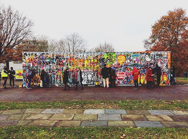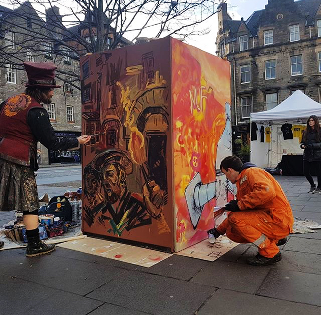 The artists created murals that the public could get involved in, themed on Edinburgh's Porteous Riots. Elph's mural was painted on and contributed to by people passing by, whilst Chris Rutterford made portraits of members of the public and added them to his mural.