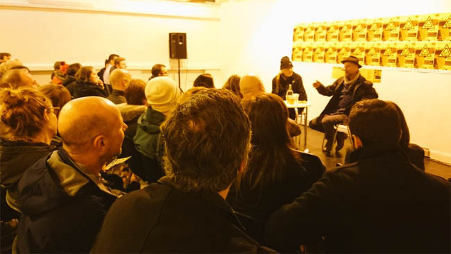 As part of the ADP stop in Glasgow, Jimmy Cauty and Steve Lowe took part in an artist talk at Platform discussing the Riot tour, dissent and revolution. The event was free but ticketed and preceded a concert at the space by Sarah Neufeld and Stefan Schneider.