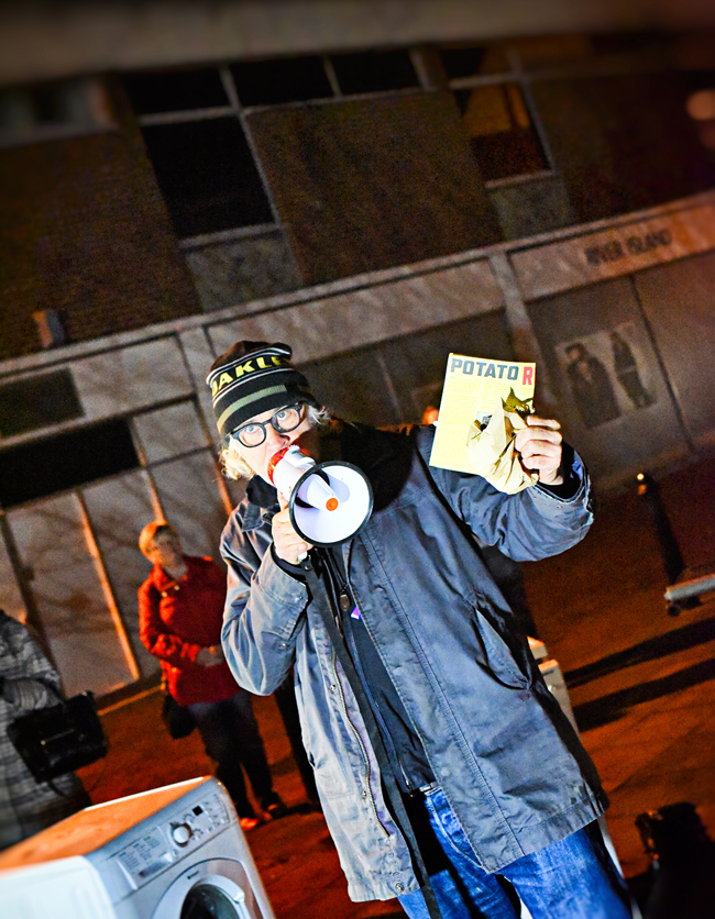 The community in Macclesfield put on a creative and curious stop for the tour. Local artists were engaged from start to end: Ralph McGaul created a woodcut of the 1812 potato riot and prints of this helped fund the stop; on the opening night Mayoress Alift Harewood-Jones launched the ADP with a bottle of locally brewery Red Willow Brew; there was a 'domestic commotion' percussion performance on white goods by Several Unidentified Males, lead by John Hartshorn; "The Price of Potatoes" poetry written and performed by Mark Rawlins and a Q & A with Jimmy Cauty.