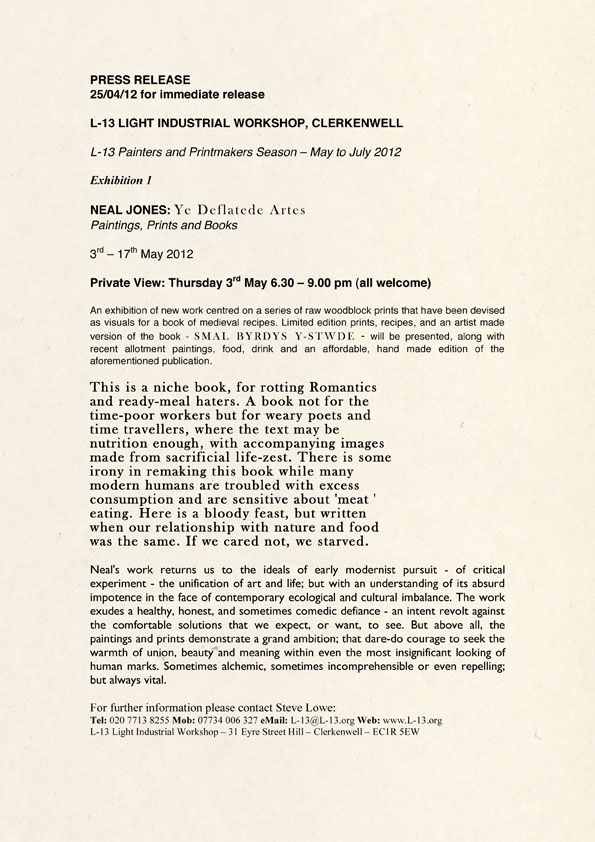 Online Catalogue | L-13 related EXHIBITIONS | Exhibitions ARCHIVE | COMPLETED EXHIBITIONS June 2011 - December 2012 | NEAL JONES: Ye Deflated Artes | Press Release