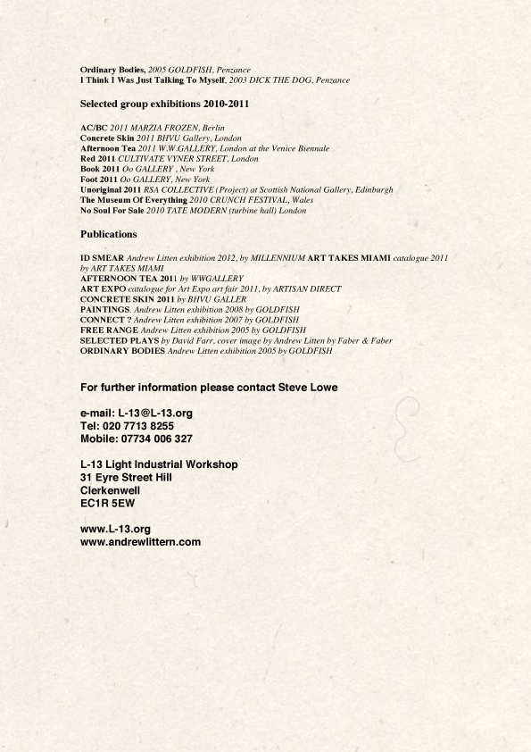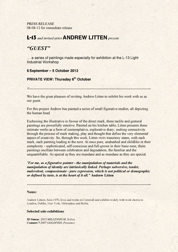 Online Catalogue | L-13 related EXHIBITIONS | Exhibitions ARCHIVE | COMPLETED EXHIBITIONS June 2011 - December 2012 | NOW ON - Andrew Litten "GUEST" | Press Release and Catalogue